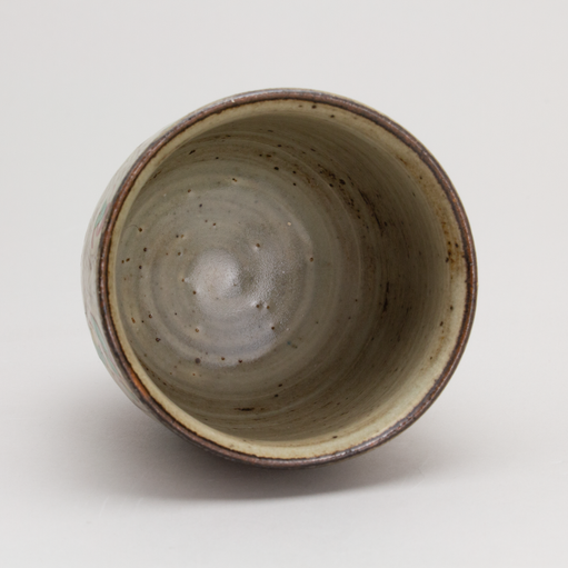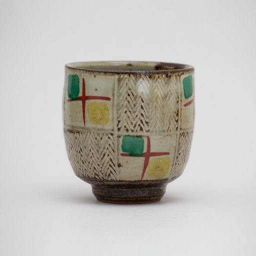 A set of 5 tea cups, rope and slip inlay with wax resist overglaze enamel decoration, stoneware
